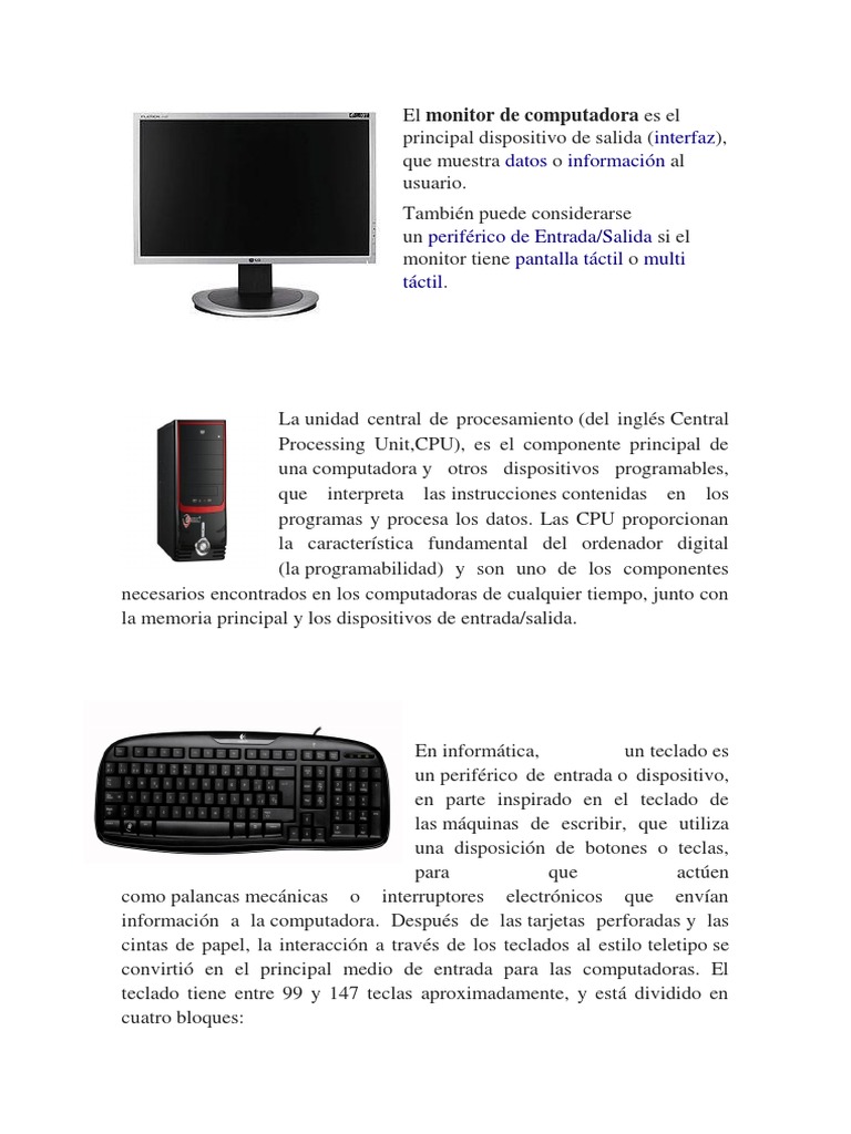 Es aquel que nos muestra todo tipo de información o datos se conecta a la computadora por medio de una tarjeta de vídeo. Los soportes físicos son elementos electrónicos que trabajan conectados para proporcionar. Los componentes de una computadora. Hasta los elementos más comunes en una computadora como el teclado o el mouse están conectados a ella.