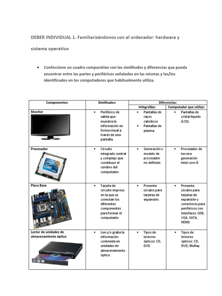 El que se encuentra dentro de la torre o cpu y que por lo tanto no podemos ver a simple vista. Clasificaremos el hardware en dos tipos. La informacion viaja lo mas rapido posible y la velocidad no depende del software mas. Escriba por lo menos en cada casilla dos características representativas de cada una de las áreas mencionadas en el cuadro además en el recuadro pequeño adiciónele un número para calificar de 1 a 10 con el objeto de indicar que tanto cumple el dispositivo de cómputo con la característica que se evalúa.