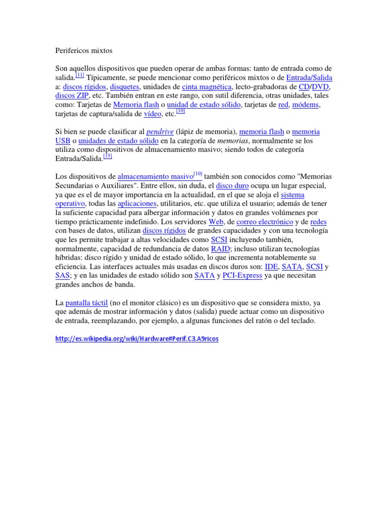 Los periféricos mixtos o bidireccionales son aquellos dispositivos electrónicos que operan como entrada y como salida de información permitiendo introducir o extraer datos del sistema ya sea como soporte rígido físico transportable o no. Dispositivos de entrada y salida y mixtos 1. De entrada de salida mixto. 2 los dispositivos de salida.