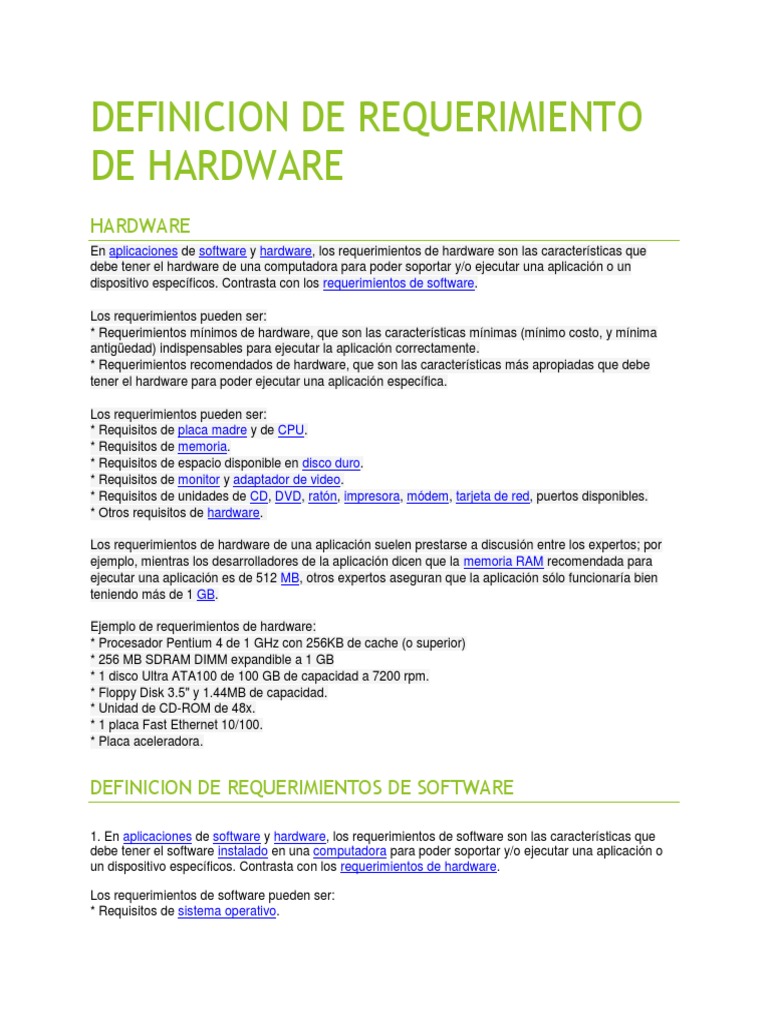 Ejemplo requerimiento de hardware. El hardware es el conjunto de las partes físicas que integran el cuerpo de un sistema computarizado. Cuando hablamos de las. Otros ejemplos de requerimientos de producto el sistema será desarrollado para las plataformas pc y macintosh. Ejemplos de requerimientos de hardware a continuación un ejemplo típico de requerimientos de hardware para una aplicación.