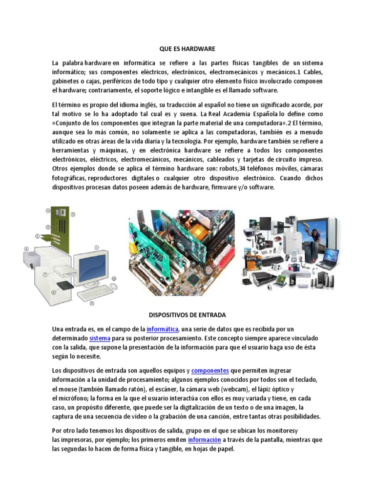 Ejemplos de la palabra hardware. El hardware está formado por circuitos electrónicos eléctricos electro mecánicos y mecánicos según sea su finalidad. Hardware es la parte física de un ordenador o sistema informático. La cpu procesa la información que ingresa al equipo. Desde ya que todo el software también debe estar debidamente preparado.
