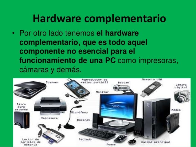 Para el funcionamiento del equipo ya que al quitar estos elementos la computadora seguirá con su funcionamiento normal. Un hardware no es más que el componente tangible del computador es decir aquella parte que podemos percibir por el sentido del acto y que se halla en estado físico. Hardware complementario entendiendo por complementario aquel que sirve para realizar funciones específicas más allá de las básicas las cuales no son estrictamente necesarias para el funcionamiento de la computadora.