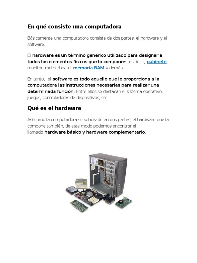 Se entiende por hardware a todas las partes físicas que integran una computadora u ordenador así como diversos dispositivos informáticos que cuentan con algún tipo de software como es el caso por ejemplo de sistemas operativos en celulares. Un hardware no es más que el componente tangible del computador es decir. En otras palabras una cámara de vídeo es un transductor óptico. Son las piezas fundamentales e imprescindibles para que la computadora funcione como son.