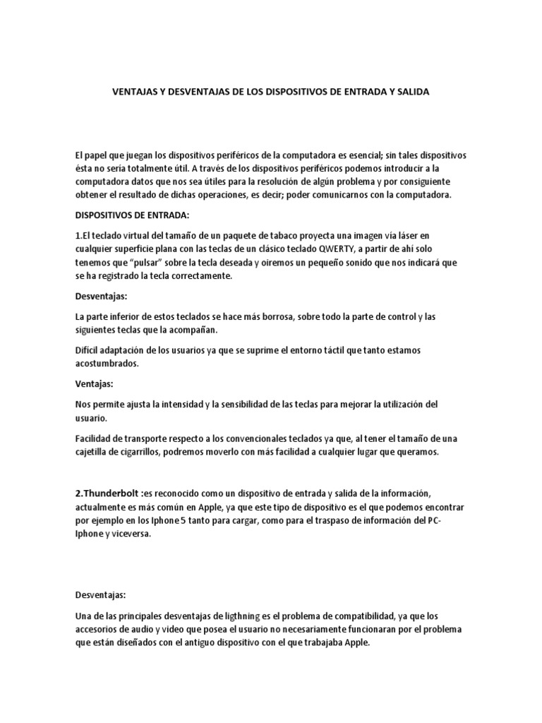 Ventajas y desventajas de dispositivos de salida y entrada dispositivos de entrada. Ventajas y desventajas de los dispositivos de entrada y salida. Convierten la información en señales eléctricas que se almacenan en la memoria ya mencionada a continuación mencionare algunos dispositivos con sus ventajas y desventajas 1. Ventajas y desventajas de los dispositivos de entrada desventajas desventajas desventajas desventajas al utilizar el lápiz ótico como un lápiz normal o sea de forma inclinada el censor detectará el haz en otro de los miles de puntos que componen la pantalla por lo tanto se.