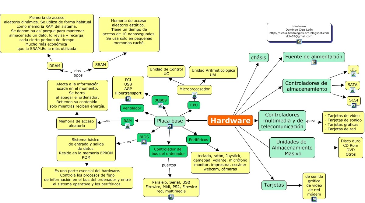 Mapa conceptual hardware. Incluyen conceptos usualmente encerrados en círculos o cajitas de algún tipo y relaciones entre conceptos indicados por una línea conectiva que. Hardware grupo de elementos físicos del computador dividido en dispositivos entrada salida procesamiento almacenamiento mixtas medios con que el usuario proporciona órdenes al computador para que este las procese proporcionan al usuario el resultado final de la información realizan el trabajo pesado del equipo a través de un programa donde se guardan los. Resumen y mapa conceptual. Un mapa conceptual de hardware 1.