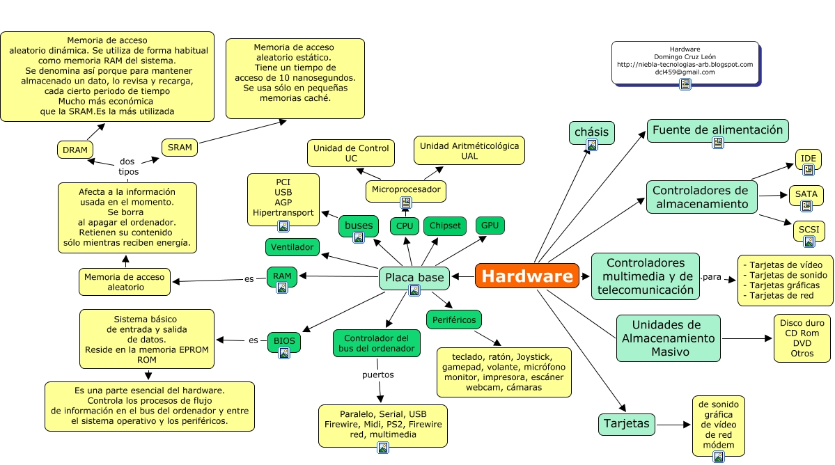 2007166633 todo es lo que se puede tocar se clasifica memoria principal procesador dispositivos de dispositivos de entrada dispositivos de salida almacenamiento secundario los datos crudos físicamente son todos los medios del cd diskekte monitor se transforman en pequeños chips computador por donde se información útil. Las redes de comunicación son uno de los sub campos dentro de la revolución de internet que ha tenido un hiperdesarrollo y tiende a seguir asombrando con las posibilidades que potencialmente permiten lo que augura para el futuro la aparición de nuevo hardware y nuevos protocolos que la mente de muchos usuarios comunes no llegan a visualizar. Mapa conceptual hardware 1. Central proces unit unidad cntralde proceso es el encargado de realizar los calculos memorias principales ram random acces memory memoria de acceso aleatoreo es volati cuando se apaga se borran los datos rom reed only memory memoria de lecura solamente la proveeel.