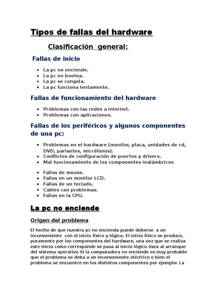 Test capitulo i. Fallas del hardware las fallas mayores de hardware son todas aquella en las que se tiene que hacer una reparacion a nivel componente es decir el cambio de algun componente que ya no funcione presente fallas o este quemado tales componenete podrian ser transistores reguladores integrados filtros capacitores etc debido al la miniaturizacion y nivel de integracion de componentes aveces es muy dificil y costoso coneguir las piezas de reemplazo por lo cual es mas conveiente cambiar el. Hardware i 2016 martes 31 de mayo de 2016.